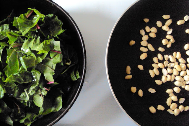 Slice the onion and chard and sauté these briefly. At the same time, dry roast the nuts and seeds. I just do this in a fry pan without adding oil. Make sure to move the nuts around a bit during this process, either by stirring or shaking the pan. You will know they are ready because the pumpkin seeds will start popping.